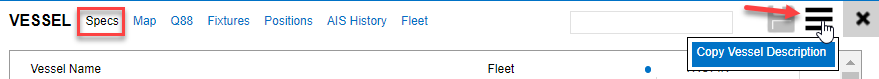 Select the vessel and hit the shortcut key “V” for Vessel’s Specifications (Specs tab). Click the action menu on the right side of the window panel and click on the “Copy Vessel Description.”
