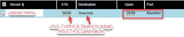 If you want to use this information as the vessels open position, then the keyboard short-cut “Ctrl-Space” will replace the Open Port field with the AIS Destination and the Open Date field with the AIS ETA.