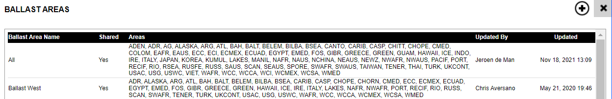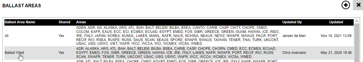 The Ballast Areas page lists all the currently saved Ballast Areas. Select the one you wish to delete.