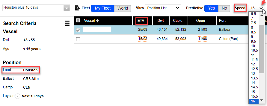 When a load port or area is specified then the ETA column in the position list will display the ETA of all the ships from their Open Port and Date to the Loading port or area.