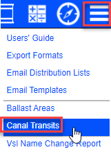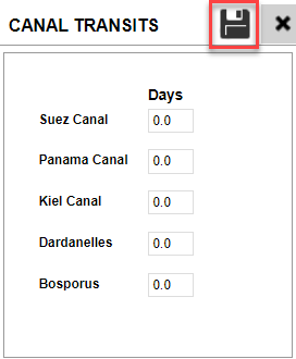 In the upper action menu, by clicking on the ‘Canal Transit’ button, you can add time to each of the following canals/areas: