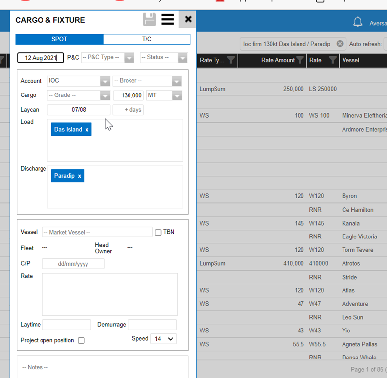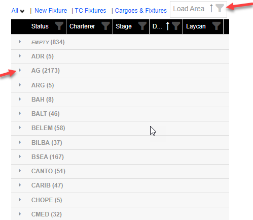 For example, if you want to see fixtures broken down by Load area, drag the Load Area column into the header and drop next to the words “Cargoes & Fixtures” or “Public Cargoes & Fixtures”, as below. You can further break down the view by clicking on the arrow next to the selected load area: