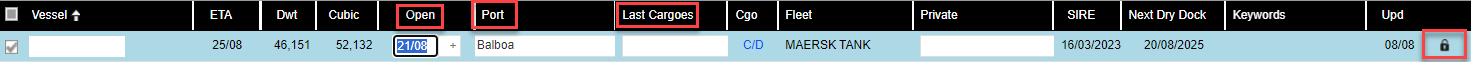 If a user updates the Port Open, Open Date or Last Cargoes, the position will be locked and the padlock symbol will appear next to the Column Updated in the list :