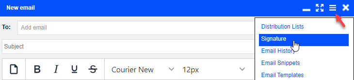 When in the New email window click the action menu and select Signature to add / edit your own signature: