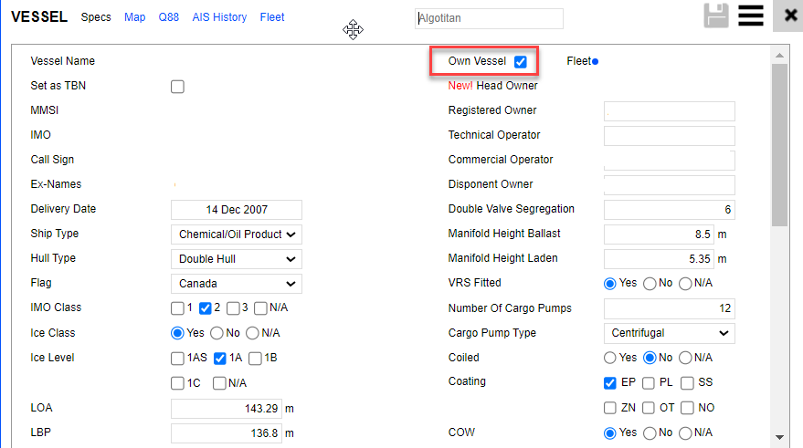 In the Vessel Specs section (select the vessel, hit the shortcut key V for specs), click the box ‘Own Vessel’ and Save from the disk symbol. If this box is unchecked, the vessel gets removed from “My Fleet”. For more on the vessels specifications see PL for Principals - Vessel Specifications / Vessel Details