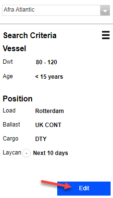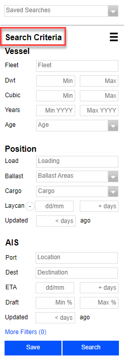 Search Criteria: Combine Vessel and Position search criteria or Vessel and AIS search criteria to search for ships based on their open position or their AIS destination / location.