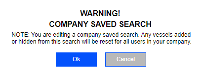 Editing a company saved search will affect all users and any vessels that were manually added or hidden from the search will be reset back. The following warning will remind you