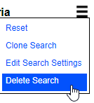 When viewing a Saved Search and you wish to delete it. Click the Actions menu (tri-bar) next to the Search Criteria and select “Delete Search” from the menu.