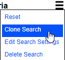 When viewing a Saved Search and you wish to create a duplicate version of it. Click the Actions menu (tri-bar) next to the Search Criteria and select “Clone Search” from the menu. Give the new search a name and select whether the new search will be shared or not.