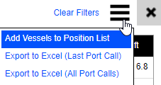 Export to Excel (Last Port Call): Export the list of vessels in the window and the information from the last time the vessel called the port directly to Excel