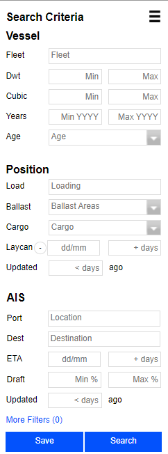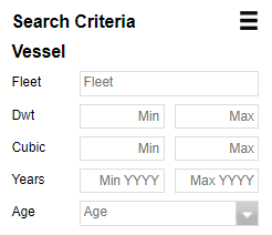 Vessel criteria can be combined with Position OR AIS criteria. Combining both Position and AIS criteria may not return results with valid data. When searching for ships based on their AIS criteria, only the Cargo can be combined from the Position Criteria.