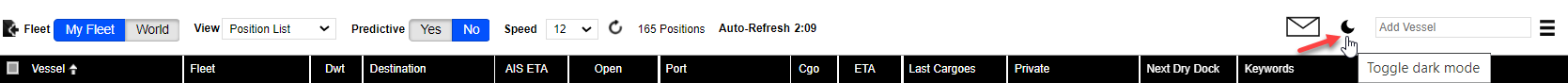 To enable ‘dark mode,' click the sun symbol in the upper right as indicated by the arrow in the previous image, and it will change to a moon icon.