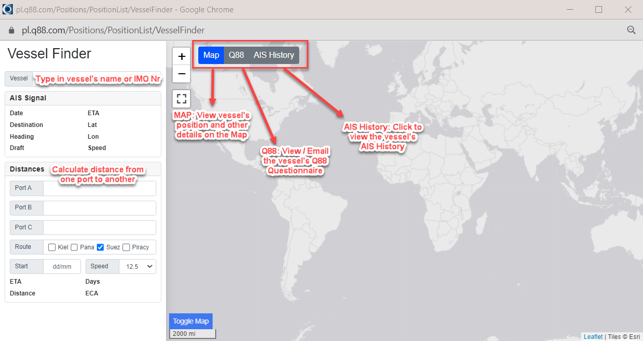 You can look up for the vessel’s details as well as calculate the distance from one port to another.