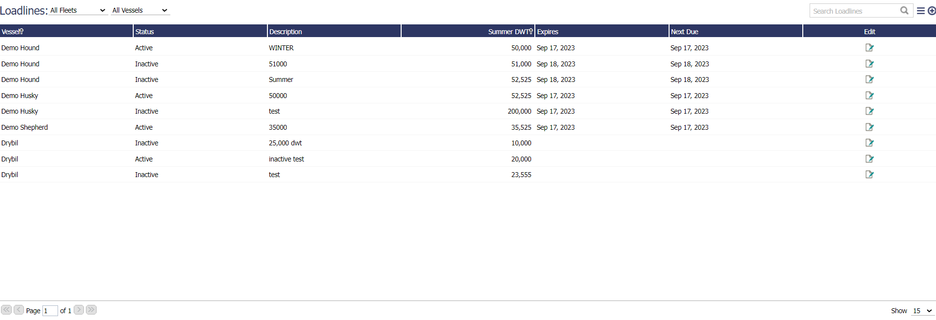 The Loadline Detail page can be accessed by clicking on the Edit icon located at the right column or double clicking on a row for any record in the Loadline Fleet Overview page.