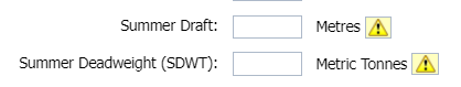 Summer Draft and Summer Deadweight (SDWT) data fields must be completed before you are allowed to click on the Create button. The rest of the fields are optional. If any of the required fields are left blank, the yellow triangle with the exclamation mark will pop up as per the below screenshot.