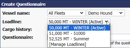 When you select a vessel that has multiple loadlines on the Create Questionnaire module, the loadline drop-down will display as per below: