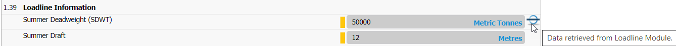 Many questionnaires will require information of the vessels loadline. When you are creating questionnaires that contains specific questions regarding loadline details, a Loadline icon will appear to the right of the field, indicating that the system has automatically populated the field with data from the Loadline module.