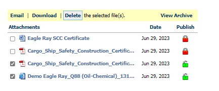 Navigate to the Vessels tab → Certificates & Docs → click on the edit icon → select the Attach File button → select the document from your Desktop.