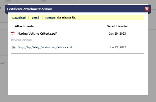 The Certificate Attachment Archive window will appear where you have the option to Download, Email, and Restore the current attachment.