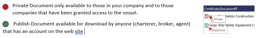For certificates with attached documents, the system will display a paperclip icon next to the vessel name which you can click to view the certificate. Please see the following explanation for the paper clip colors.