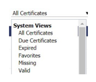 All Certificates filter: Allows you to select from a predefined list, such as the System Views for your fleets’ certificates. You also have the ability to create your own Custom Views.