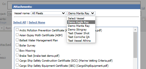 For Q88 users, the list of vessels will appear under the Select Vessel field where the system will show you which attachments are available for that specific Vessel.