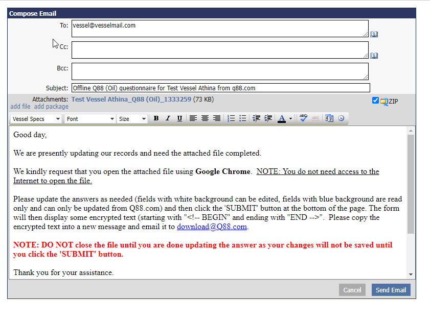The vessel’s email address will be added automatically as retrieved from the questionnaires and you can add more recipients if necessary.