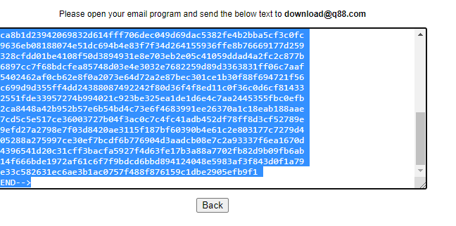 By clicking on the Submit button, the questionnaire will be transmitted into an encrypted text, which needs to be copied and sent via email to download@q88.com.