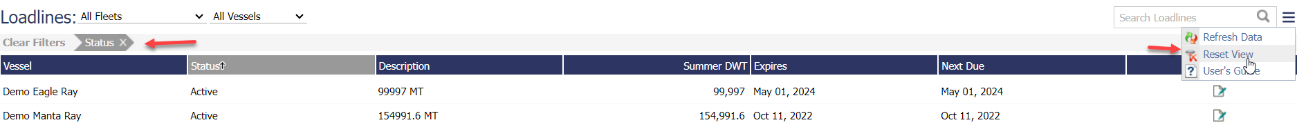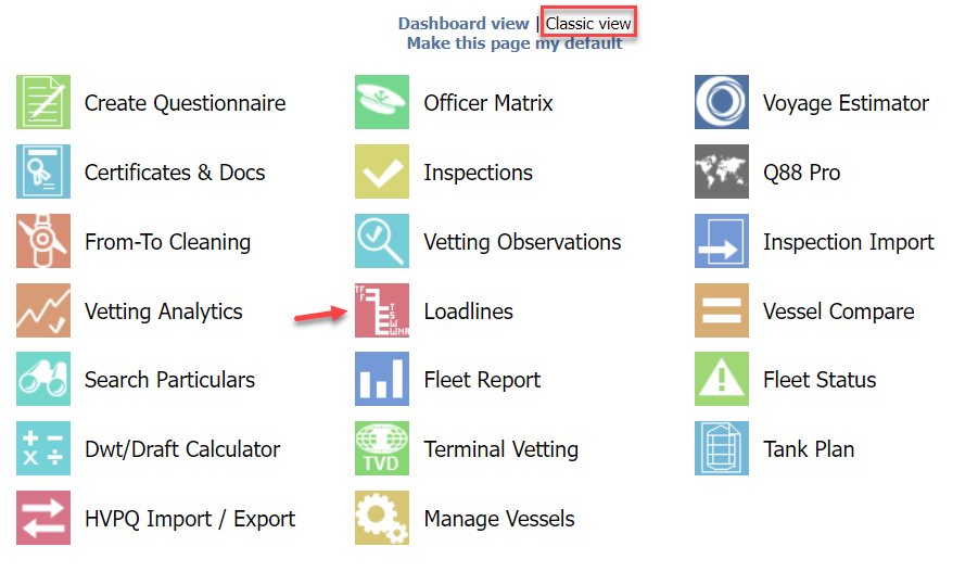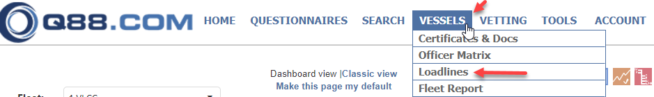 The below image is a screen-shot of the Loadline Fleet Overview page; this is the new standard interface which is used across many of the modules on Q88 and offers several key enhancements that allow better access to manage and view the Loadlines for your fleet.