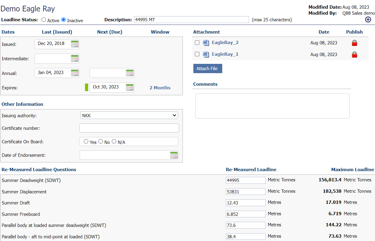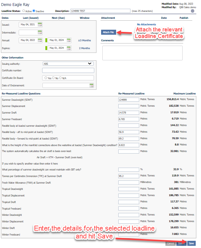 Inactive: | An ‘Inactive’ loadline does not populate any other modules for the vessel on Q88 but an inactive loadline can be used when creating a questionnaire if it is needed due to a specific voyage requirement. |