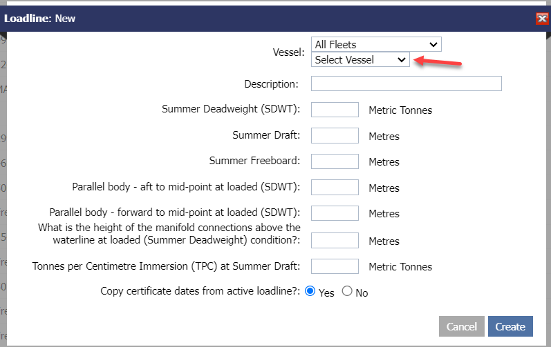 A popup is displayed where you can specify the vessel you want to add a loadline for (Select Vessel) :