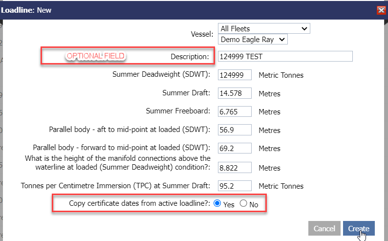 If there is another active loadline already existing for the same vessel you can select to “Copy certificate dates from active loadline?” by Yes or No (see screenshot below):