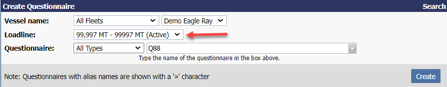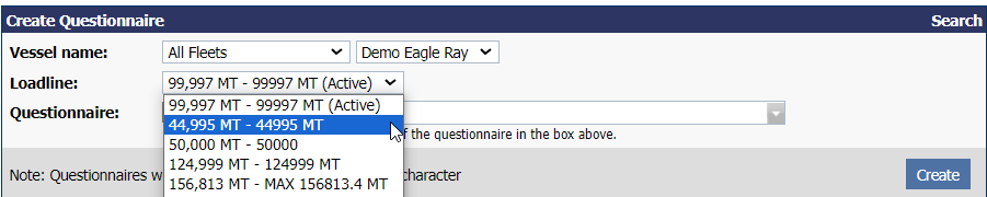 When you select a vessel in the Create Questionnaire module which has one or more loadlines, the loadline drop-down will display as per below: