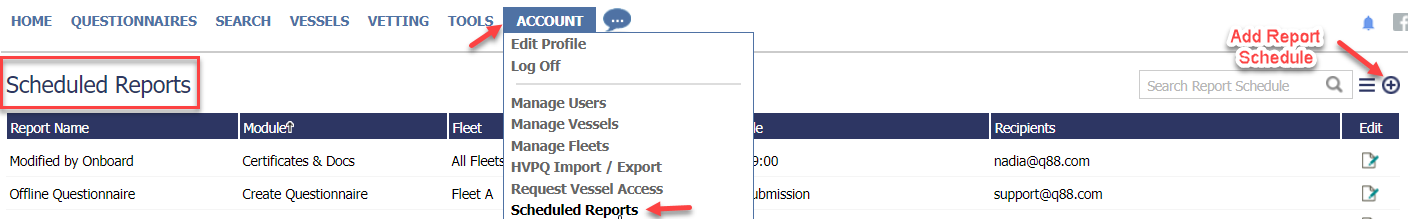 You can subscribe to the Loadline email notifications from the “Account / Scheduled Reports” menu. Click the Add symbol to add report schedule.