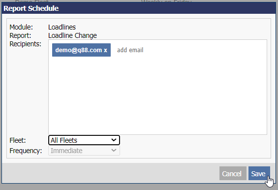 Below example is for the report “Loadline Change”. Add the Recipients email address(es), select Fleet and Save.
