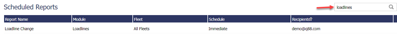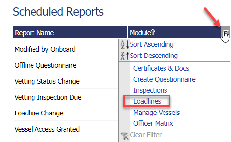 To Filter the Scheduled Reports column “Module” on Loadlines click the arrow and select the Loadlines option from the dropdown