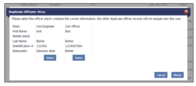 As Officers perform tours on different vessels, their personal information may be entered differently on the Offline form each time. To address this, the Merge Officers feature was created.