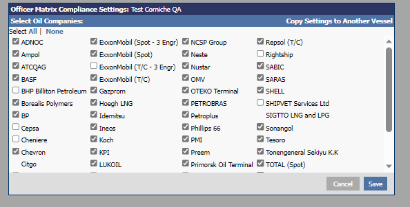 A popup window will appear, where the system will analyze the vessel’s Officer Matrix based on the selected oil companies and you will have the option to transfer the settings to other vessels in the fleet.
