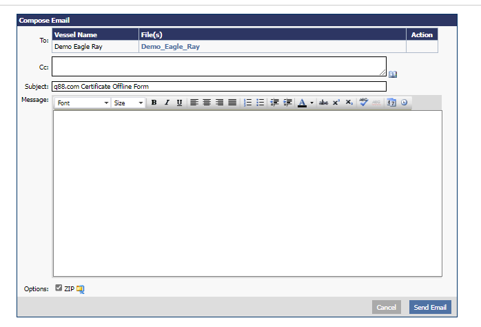 The Bulk offline form can be sent to all vessels in your fleet or you can also choose a specific vessel you wish to send the form to. Once you have selected the vessel(s), click the Email button to proceed.