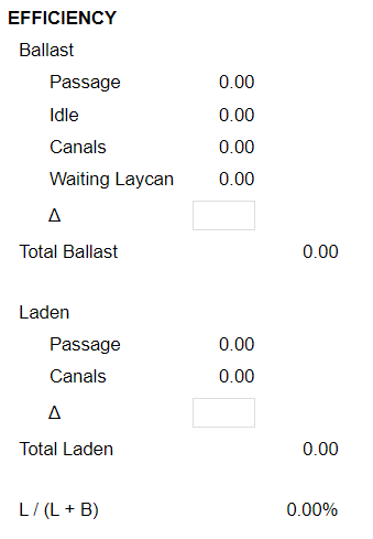 Note: The efficiency is fully calculated based on the information from the estimate. However, you can change the calculation by adding or subtracting time from either the Ballast or Laden calculations using the corresponding ∆ field.