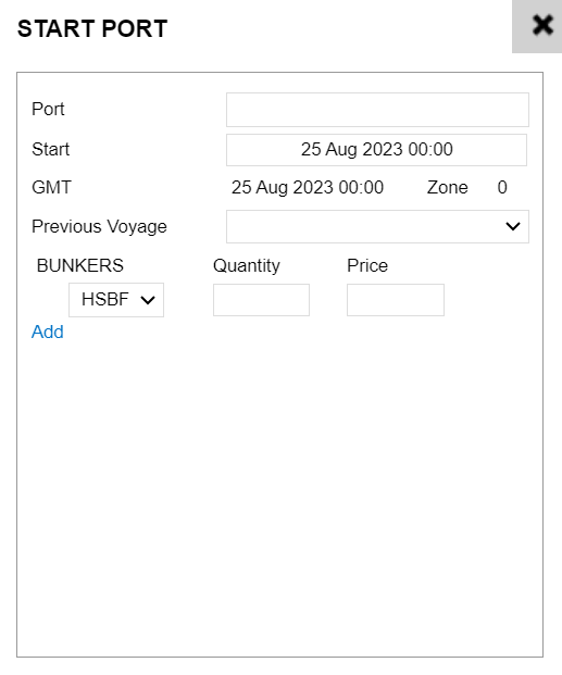 Start Port: | The first port drives all the dates and bunker ROBs for the estimate. Once you select the port name, double click anywhere in that leg to open up the Start Port screen where you can configure your starting details. |