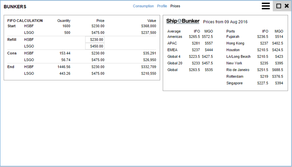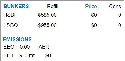 Refill: | Pricing for any missing inventory required to complete the voyage estimated. These prices are updated regularly from the Ship & Bunker feed. Users can just type in any price they wish to apply in their estimation. |