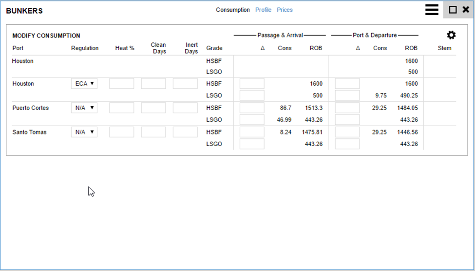 Passage ∆: | Allows for manual manipulation of estimated consumption during the preceding sea passage. Use positive or negative values representing the number of MT consumed. |