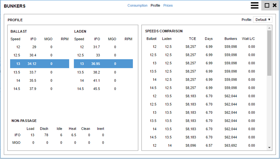 General: | The left panel lists the ballast/laden speed and consumption rates to be used when estimating bunker consumption.