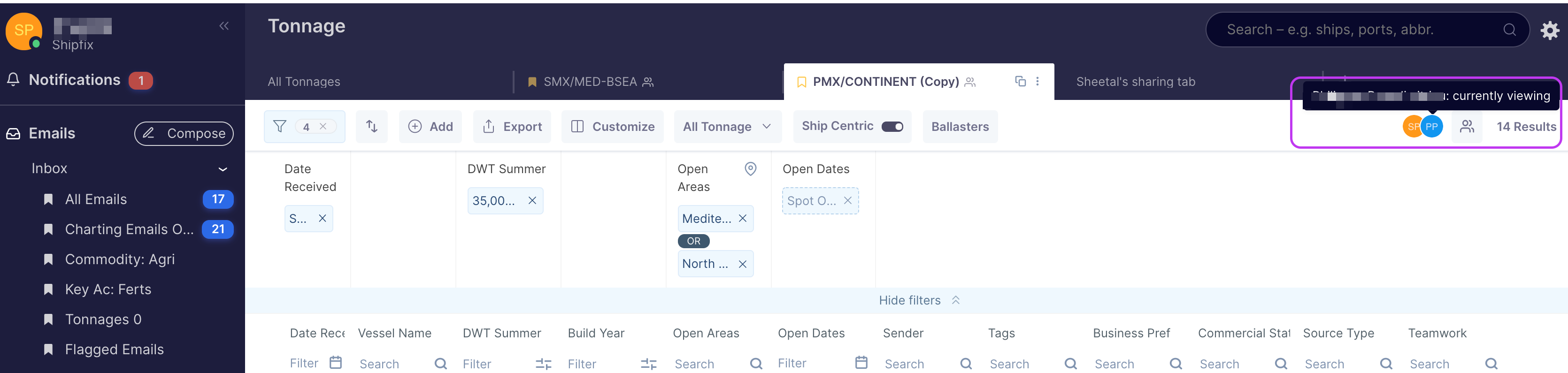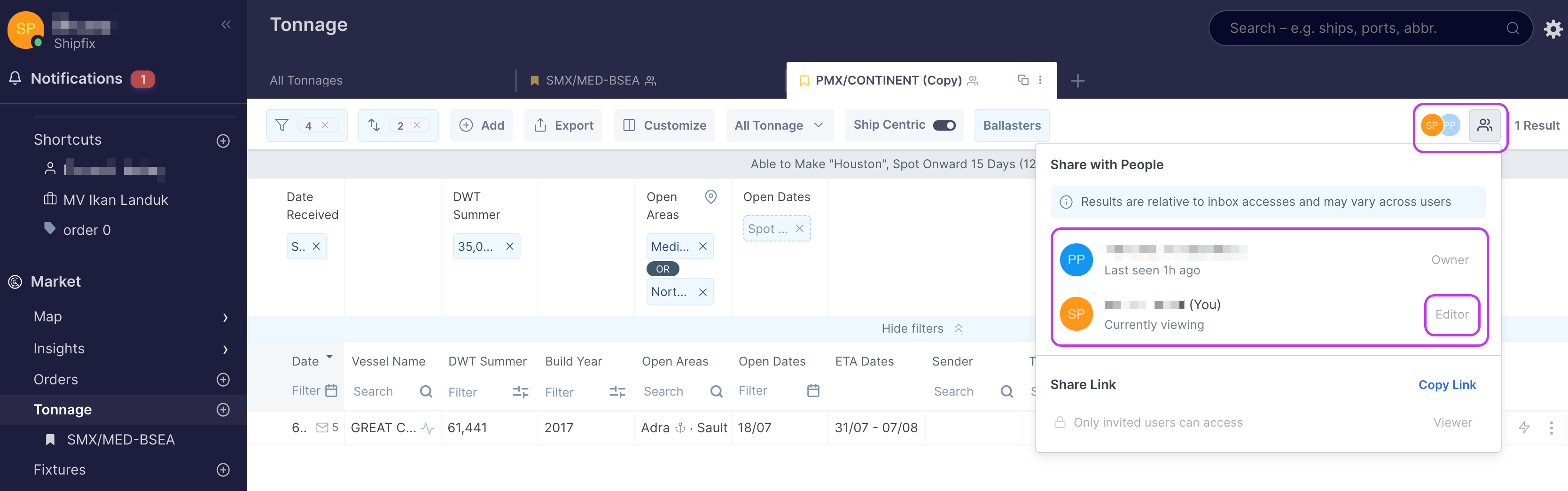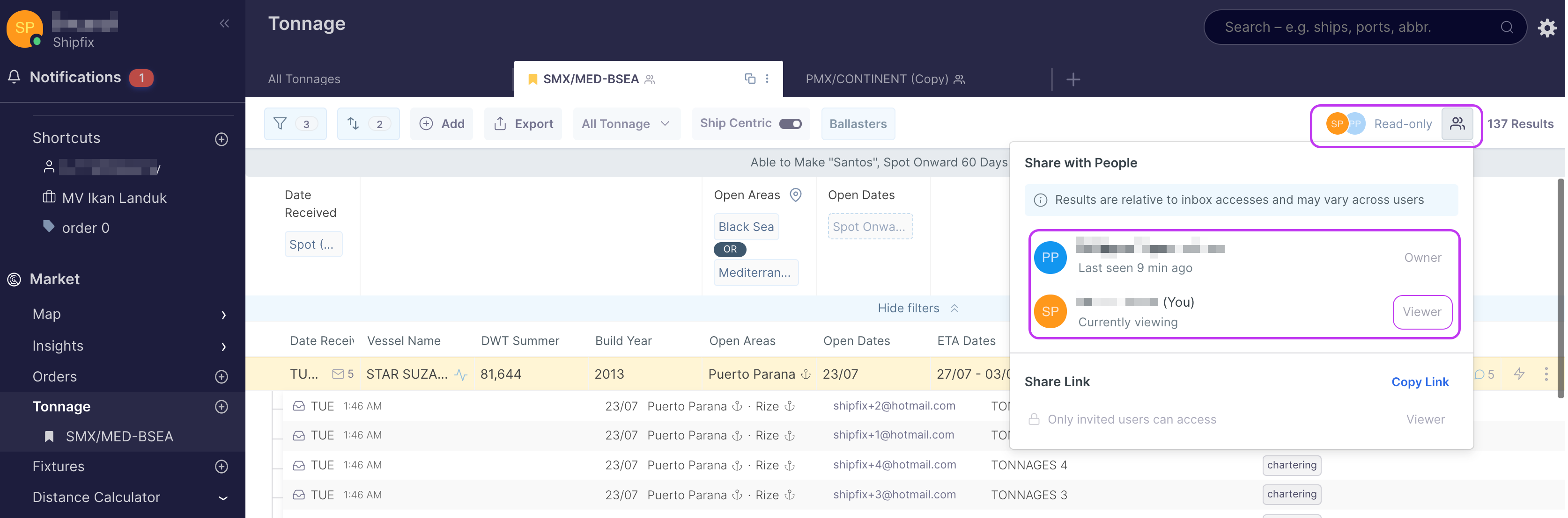 Shipfix allows you to share tabs with your colleagues. Tab sharing is available across most Market modules.