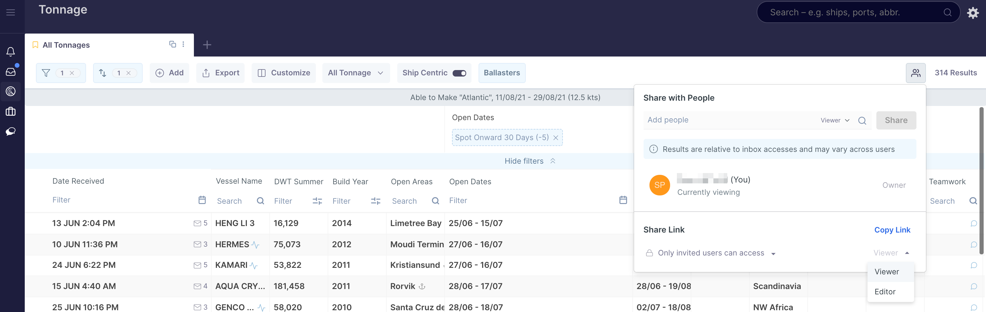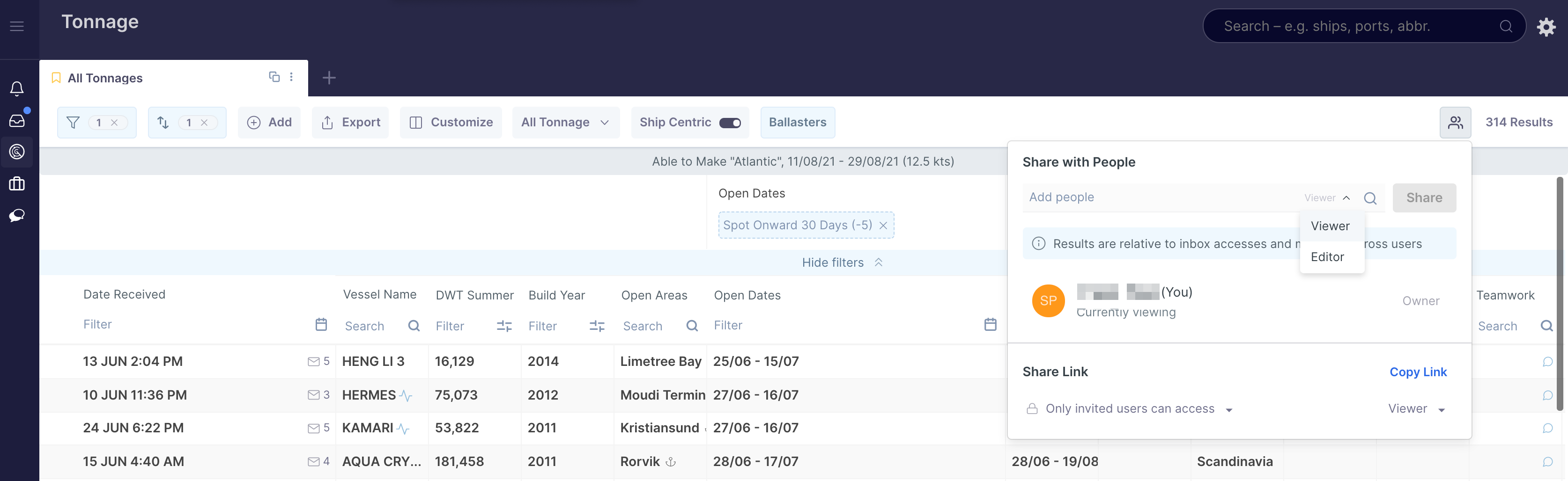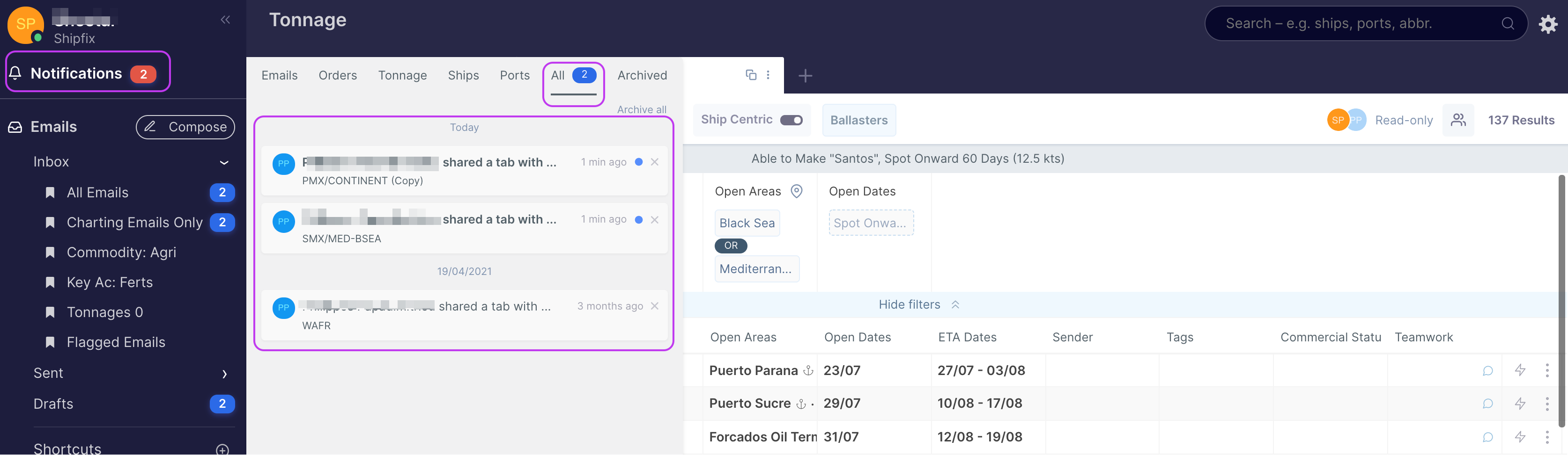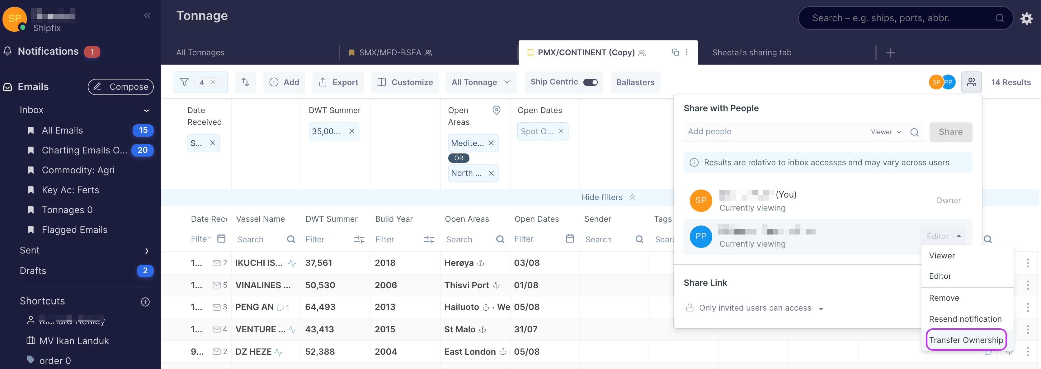 Shipfix allows you to share tabs with your colleagues. Tab sharing is available across most Market modules.