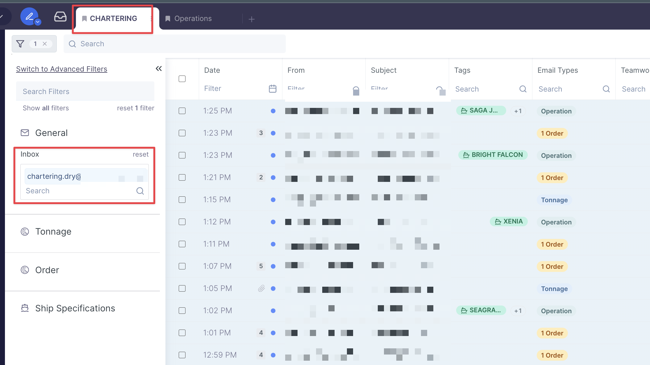Filter by 'Inbox' - For example 'chartering@yourorganisation.com'