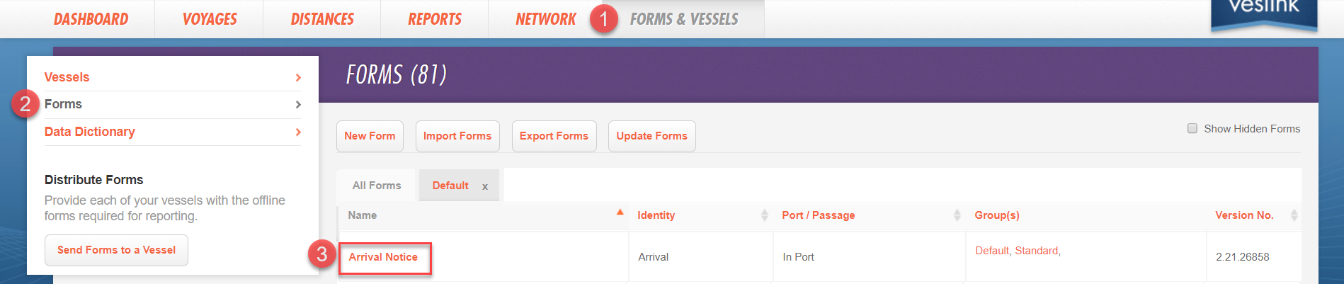 On the Veslink Forms & Vessels tab, select the form to which you want to add a Bunker Tanks table: