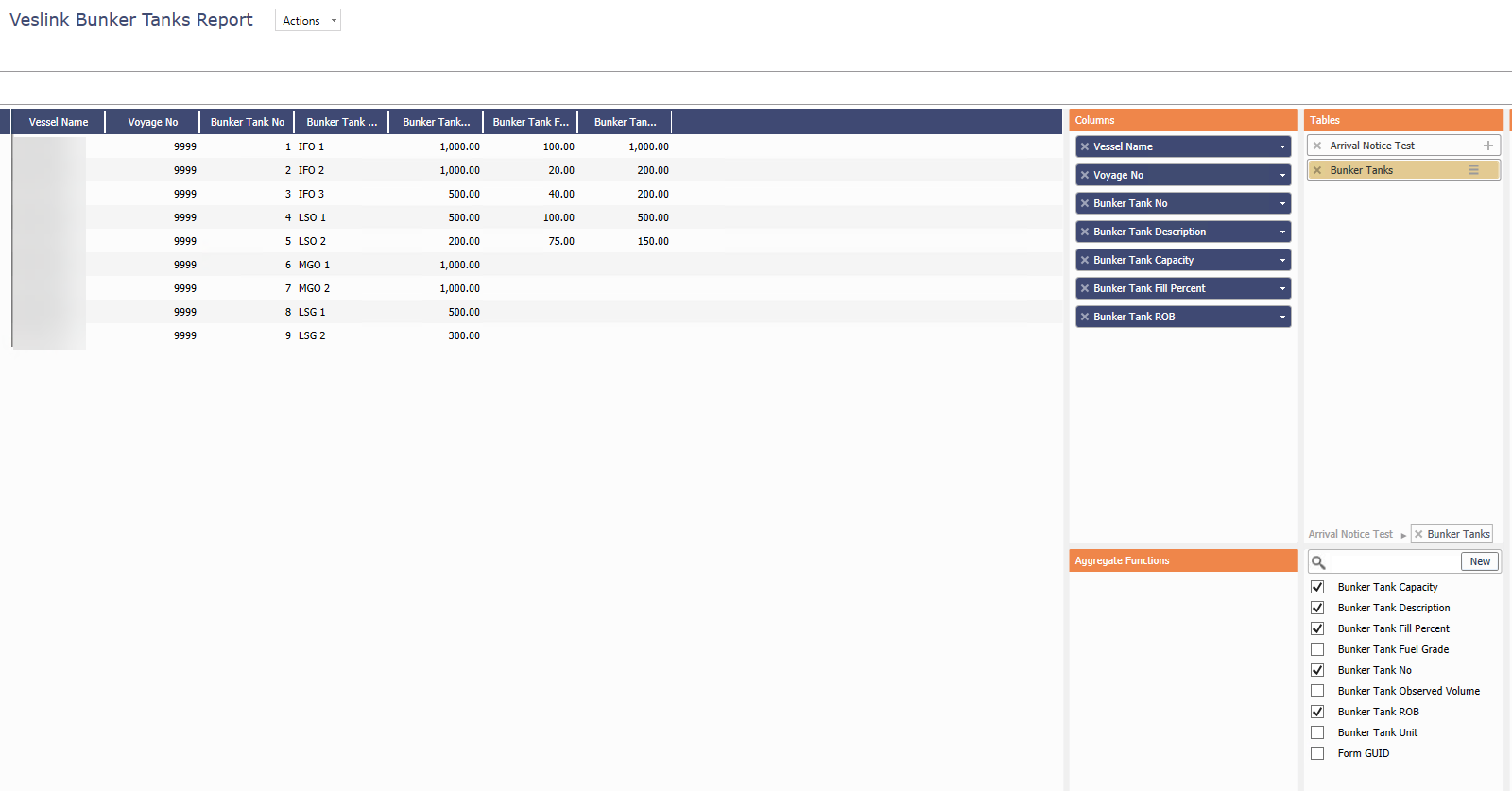 Select any necessary columns from the Bunker Tanks table. The resulting report captures bunker tank information as reported on the Veslink form: