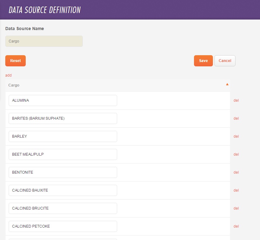 To delete a Cargo name, click del in its row.
